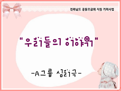순천SOS어린이마을 주관 순천시 지역아동센터 연합 심리극 집단상담 전라남도 공동모금회 지원 기획사업으로 전라남도 순천시 SOS어린이 마을에서 주관한 심리극 집단상담 프로그램을 실시했습니다. 2012년 10월부터 2013년 1월에 이르기까지 총 4개월 16주에 걸쳐 2개 집단 33명의 초등학생들이 즐겁고 의미있는 시간을 보낼 수 있었습니다. 특별히 순천시 지.. 심리극·치료·상담·교육/[심리극·역할극] 2013.01.29
